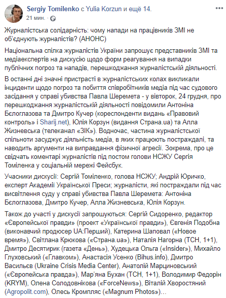 Как отметил Томиленко, в последние дни значительный резонанс в журналистских кругах вызвали инциденты с угрозами и избиением сотрудников медиа в время судебного заседания в деле об убийстве Павла Шеремета. Он напомним, что во вторник, 24 декабря, о препятствовании журналистской деятельности, сообщили Антонина Белоглазова и Дмитрий Кучер (корреспонденты изданий "Правовой контроль" и Sharij.net), Юлия Корзун (издание Страна.юа) и Алла Жизневская (телеканал "ЗИК").