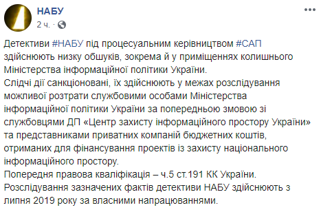 "Следственные действия санкционированы, осуществляются в рамках расследования возможной растраты должностными лицами Министерства информационной политики Украины по предварительному сговору со служащими ГП "Центр защиты информационного пространства Украины" и представителями частных компаний бюджетных средств, полученных на финансирование проектов по защите национального информационного пространства", - говорится в сообщении НАБУ.