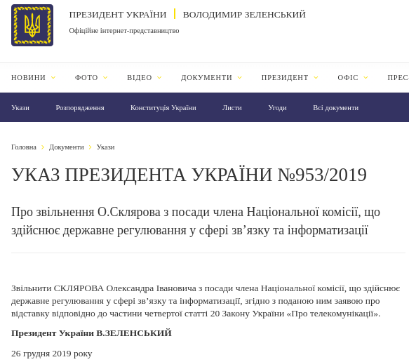 Также Президент уволил Александра Склярова от должности члена Национальной комиссии, осуществляющей государственное регулирование в сфере связи и информатизации. Указ №953/2019 опубликован на сайте главы государства.