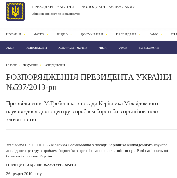 Президент Украины Владимир Зеленский уволил Максима Гребенюка с должности руководителя Межведомственного научно-исследовательского центра по проблемам борьбы с организованной преступностью при Совете национальной безопасности и обороны. Распоряжение №597/2019-рп обнародовано на сайте президента.