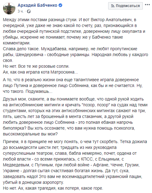 "Причем, я в принципе не могу понять, о чем тут скорбеть. Тетка дожила до восьмидесяти шести лет, тридцать из них руководила суперуспешным театром, слава, бабла немеряно, почет, ордена от любой власти - со всеми прижилась, с КПСС, с Ельциным, с Медведевым, с Путиным, при любой войне - Афгане, Чечне, Грузии, Украине - долгая сытая счастливая богатая жизнь. Да тут, с@ка, завидовать надо! Это вам не восемнадцатилетний украинский пацан, убитый в донецком аэропорту.
