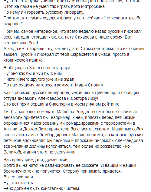 Также он снова поглумился над гибелью при крушении самолета ансамбля имени Александрова и Елизаветы Глинки (доктор Лиза), а закончил свой пост словами: "Рейх должен быть кристально чистым".