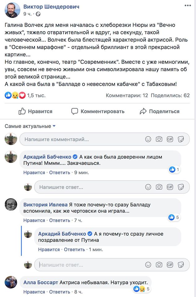 На этот раз он грязно высказался о скончавшейся накануне 86-летней российской актрисе и режиссеру Галине Волчек, назвав ее "путинской подстилкой". Свои мысли он излил в посте, вступив в полемику с другим российским журналистом, писателем и телеведущим Виктором Шендеровичем, который вспомнил в соцсети о знаменитых ролях Галины Волчек.