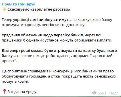Об этом сообщил премьер-министр Алексей Гончарук на своей странице в Telegram. "Отменяем "зарплатное рабство". Теперь украинцы сами будут решать, на карту какого банка получать зарплату, пенсию или соцпомощь... Теперь деньги можно будет получать на карточку любого банка, а не только там, где работодатель оформил "зарплатный проект", - написал Гончарук по итогам заседания правительства.
