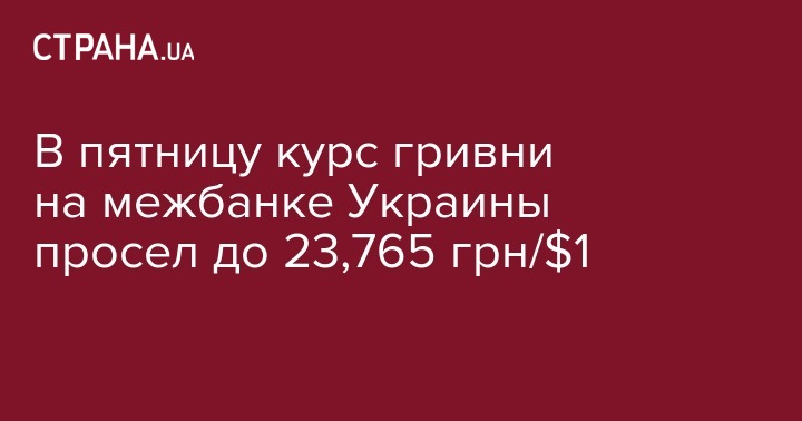 В пятницу курс гривни на межбанковском валютном рынке снизился до 23,765 грн/$1 с 23,490 грн/$1 в предыдущий рабочий день. Об этом сообщает "Интерфакс-Украина" со ссылкой на дилеров коммерческих банков.