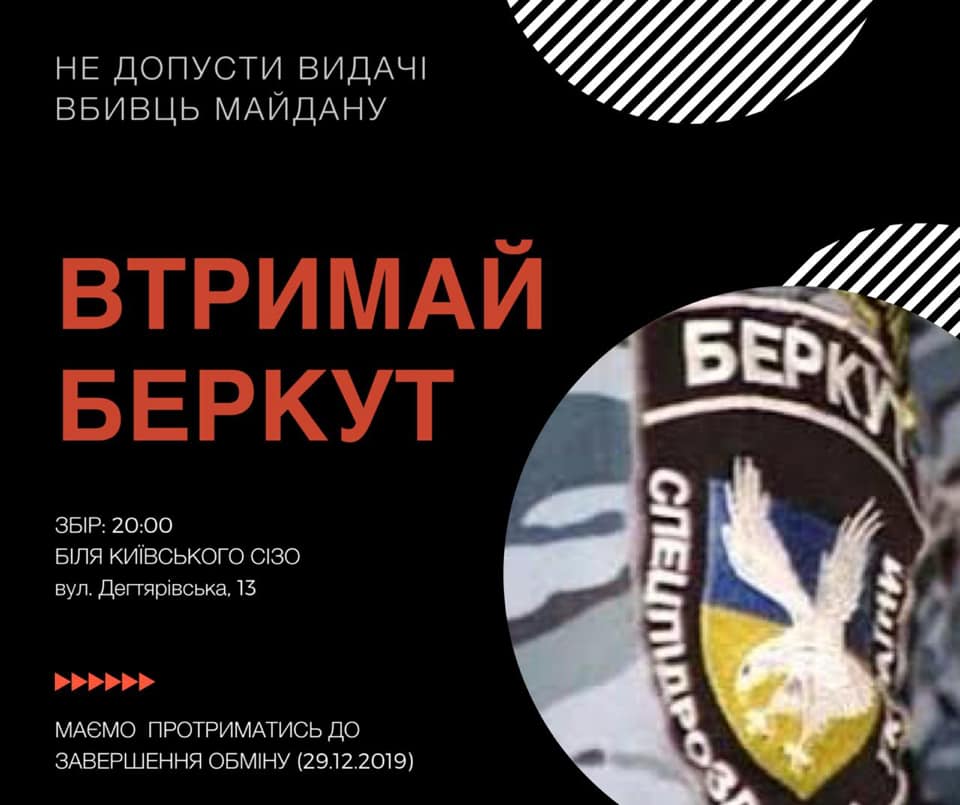 19:29 Порохоботы и националисты собирают акцию протеста под СИЗО, чтобы не допустить отправки беркутовцев на обмен. Вот такие постеры уже распространяются в соцсетях.