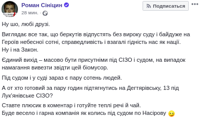 "Выглядит все так, что беркутов отпустят без суда...Единственный выход - массово присутствовать под СИЗО и судом, в случае попытки вывезти оттуда этот биомусор. Под судом и в суде сейчас пару сотен человек. А вот кто готов за пару часов подтянуться на Дегтяревскую, 13 в Лукьяновское СИЗО?" - написал волонтер Роман Синицын.