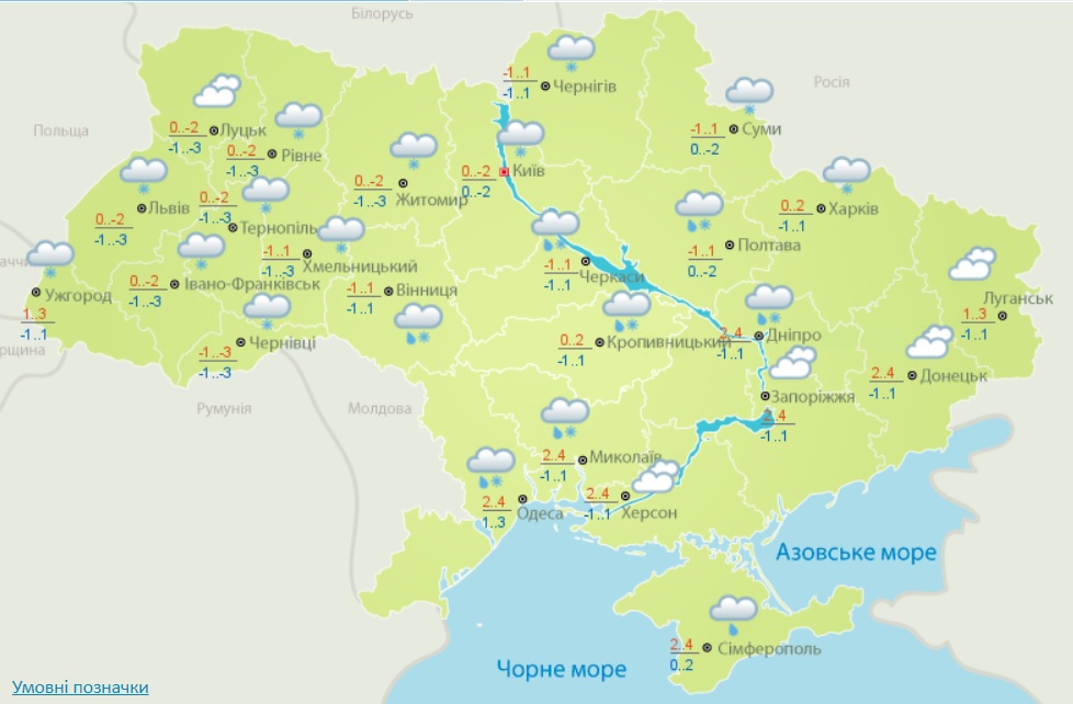 Температура на протяжении суток составит от 3° мороза до 2° тепла. Днем в южной части страны, а также в Донецкой и Днепропетровской областях 1-5° тепла; на высокогорье Карпат на протяжении суток 7-11° мороза.