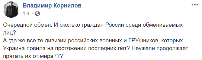 13:32 "Очередной обмен. И сколько граждан России среди обмениваемых лиц? А где же все те дивизии российских военных и ГРУшников, которых Украина ловила на протяжении последних лет? Неужели продолжает прятать их от мира?", - задает вопрос политолог Владимир Корнилов.