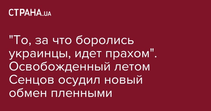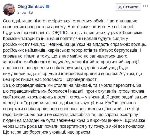 По словам Сенцова, обмен ставит под угрозу "ценности", за которые стоял Майдан: "Страна должна возвращать своих героев, но не ценой осквернения ценностей, за которые эти герои дрались. Потому что они не скажут спасибо за то, что дело расстрела людей на Майдане не было закончено хотя бы приговором виновным. Что почти через шесть лет мы начали возвращаться в ту точку, с которой все началось. Что то, за что боролись украинцы, идет прахом".