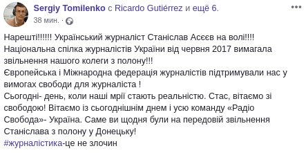 "Сегодня - день, когда наши мечты становятся реальностью. Стас, поздравляем со свободой! Поздравляем с сегодняшним днем и всю команду "Радио Свобода". Именно вы ежедневно были на передовой освобождения Станислава из плена в Донецке!"- написал Томиленко.