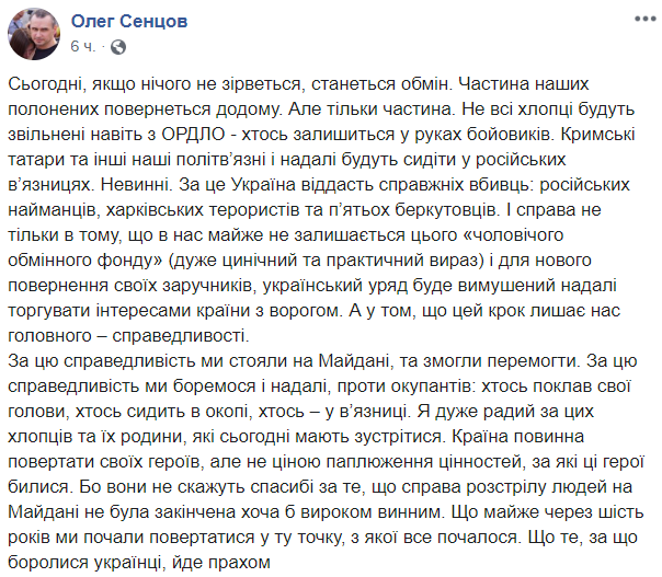 Интересно, что против обмена на нынешних условиях высказался и обменянный недавно Олег Сенцов.