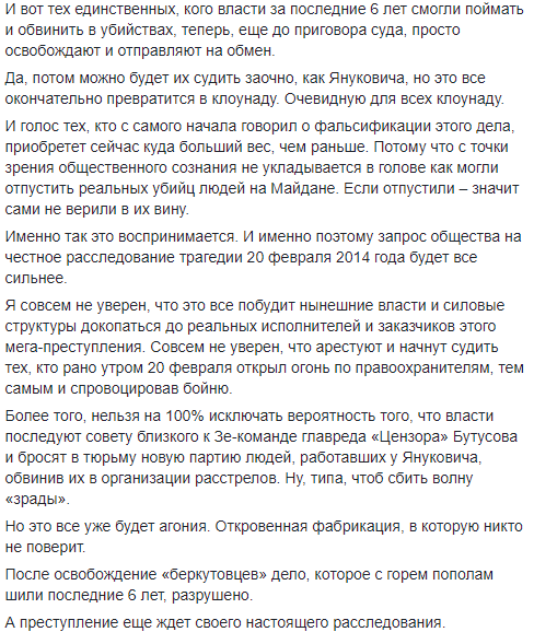 "Мои источники в правоохранительных органах утверждают, что факт выдачи России арестованных "беркутовцев" в обмен на украинских военных не приведет к остановке процесса их осуждения. Суд над "беркутовцами" продолжится после их выдачи в Россию в заочном режиме, будет вынесен приговор и их действиям будет дана оценка. Украина руководствуется принципом Израиля, который готов обменять тысячу террористов на одного своего пленного солдата".