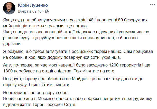 "Страна должна возвращать своих героев, но не ценой осквернения ценностей, за которые эти герои дрались. Потому что они не скажут спасибо за то, что дело расстрела людей на Майдане не было закончено хотя бы приговором виновным. Почти через шесть лет мы начали возвращаться в ту точку, с которой все началось. Что то, за что боролись украинцы, идет прахом".