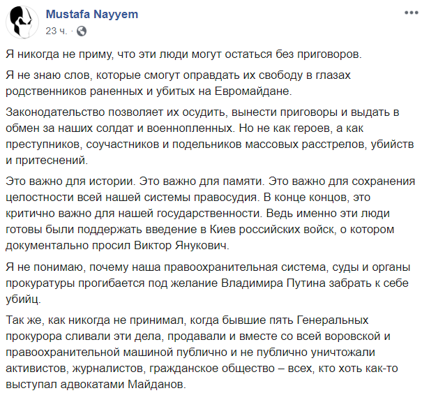 Стремление россиян получить беркутовцев под свою юрисдикцию является публичным признанием причастности Кремля к массовым расстрелам на Майдане, а операция по обмену пленными понадобилась исключительно для того, чтобы замести преступления, которые стали началом военной интервенции России в Украине", - написал он вчера в Facebook.