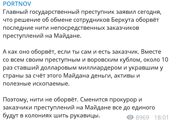 "Главный государственный преступник (Порошенко - Ред.) заявил сегодня, что решение об обмене сотрудников Беркута оборвёт последние нити непосредственных заказчиков преступлений на Майдане.