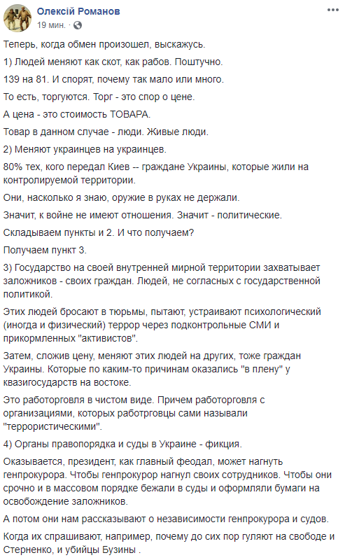 Журналист и юрист Алексей Романов также отмечает "рабовладельческий" и внутриукраинский характер обмена.
