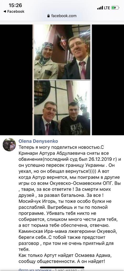 "Он уехал, но он обещал вернуться. А вот когда Артур вернется, мы поиграем в другие игры со всем Окуевско-Осмаевским ОПГ. Вы, твари, за все ответите. За смерти моих друзей, за развал батальона. За все!", сообщила Денисенко.
