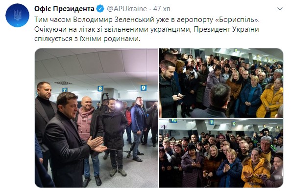 "Между тем Владимир Зеленский уже в аэропорту "Борисполь". Ожидая самолет с освобожденными украинцами, президент Украины общается с их семьями", - подчеркивается в сообщении.