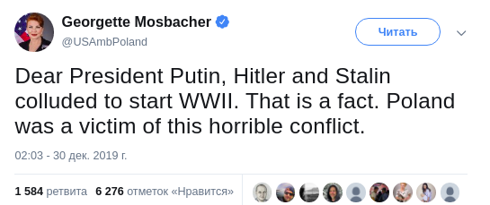 Посол Соединенных Штатов Америки в Польше Жоржет Мосбахер высказалась по поводу заявлений президента России Владимира Путина о том, что Польша якобы причастна к началу Второй мировой войны. Об этом она написала в Twitter.