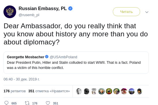 "Уважаемый президент Путин, Гитлер и Сталин вступили в сговор чтобы начать Вторую мировую войну. Это факт. Польша стала жертвой этого ужасного конфликта", - написала посол.