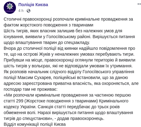 Вчера в столичной полиции от киевлянки поступило сообщение о том, что на острове Жуков в ненадлежащих условиях находятся тигры" - сообщили в пресс-службе полиции.