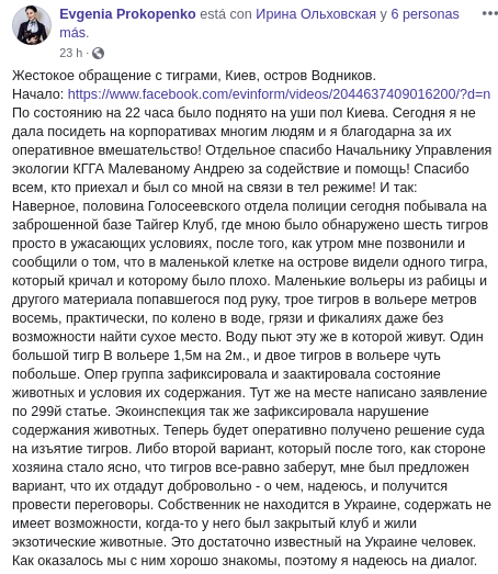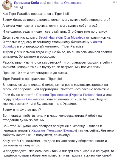 "Если бы не волонтёр Евгения Прокопенко и моя подруга Ирина Ольховская, они возможно погибли бы там. Ведь их хозяин, "светский тигр" Буланьков - не в Украине", - пишет она.