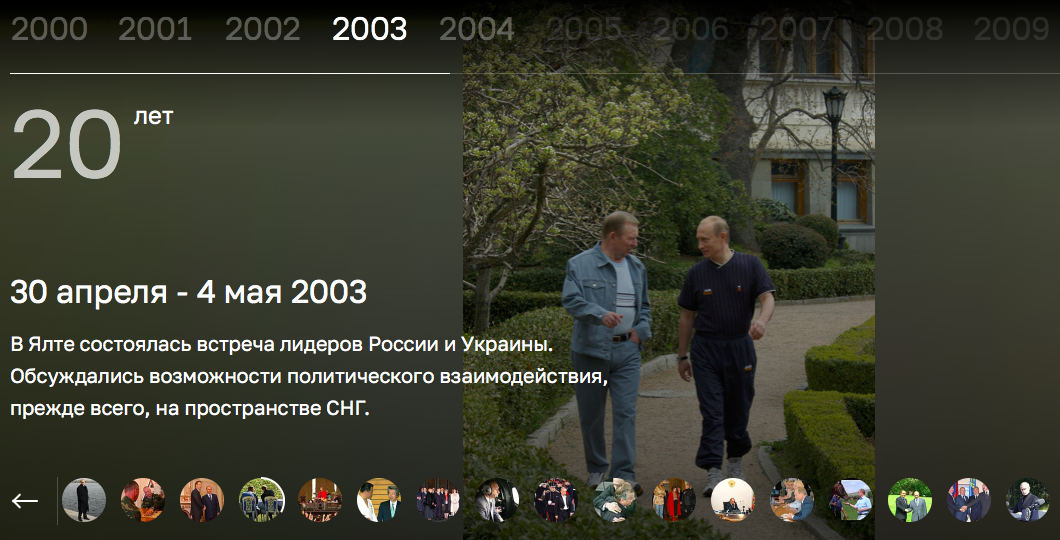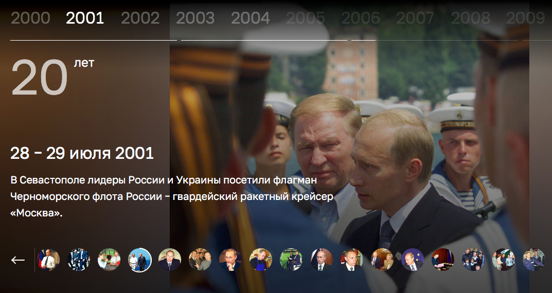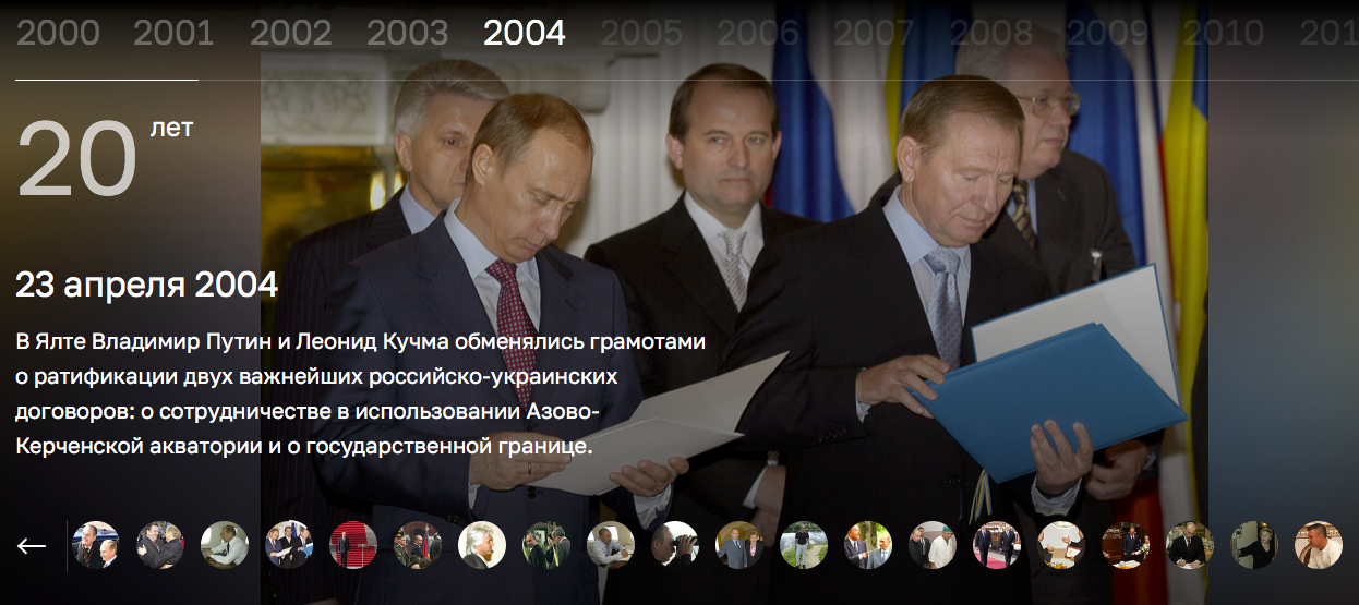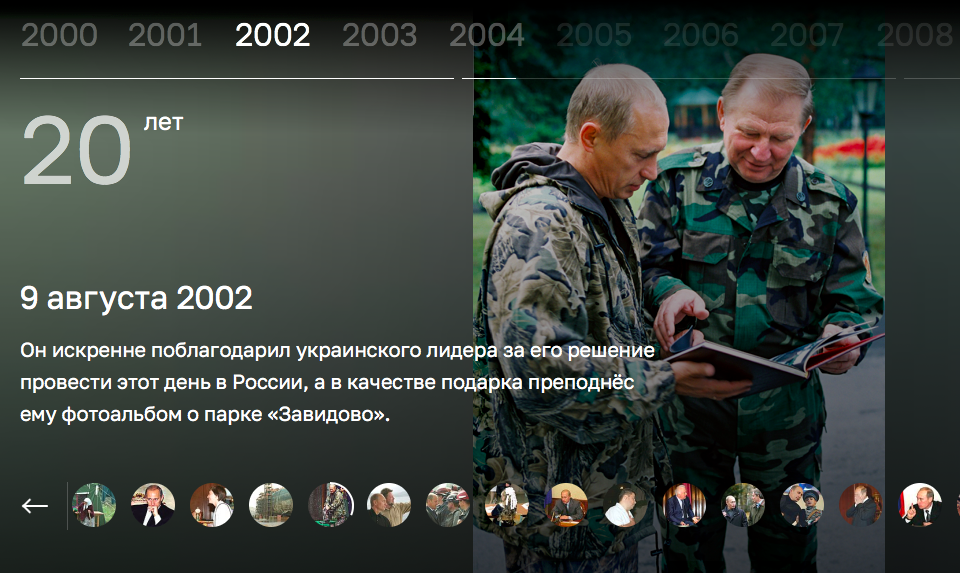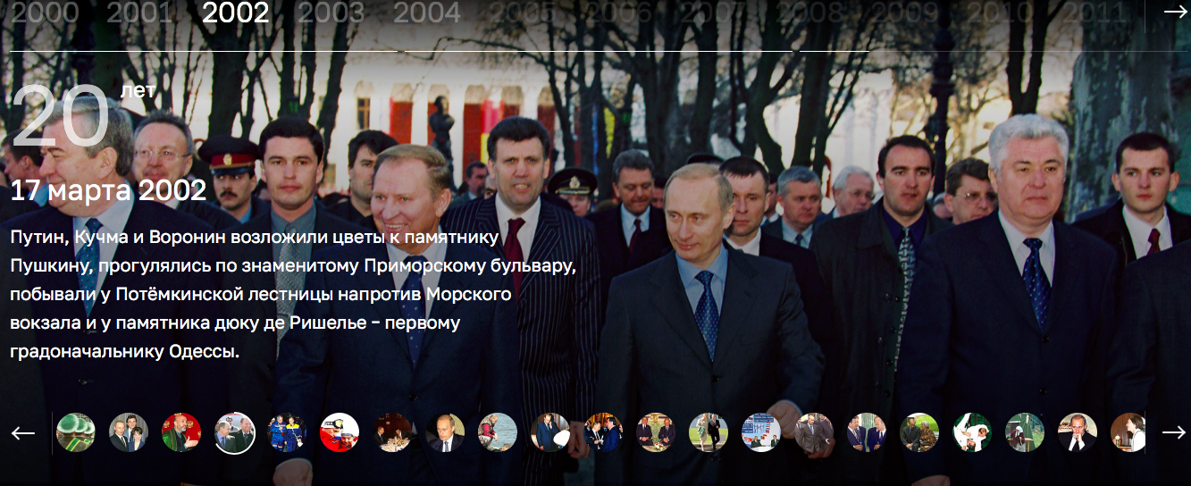 В опубликованном Кремлем фотоальбоме под названием "Путин.20 лет", приуроченном к 20-летию правления Путина, есть много фотографий с бывшим президентом Украины Леонидом Кучмой.