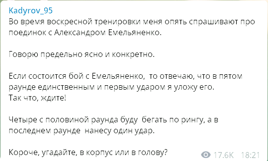 "Если состоится бой с Емельяненко, то отвечаю, что в пятом раунде единственным и первым ударом я уложу его. Так что ждите!" - предупредил подписчиков Кадыров.