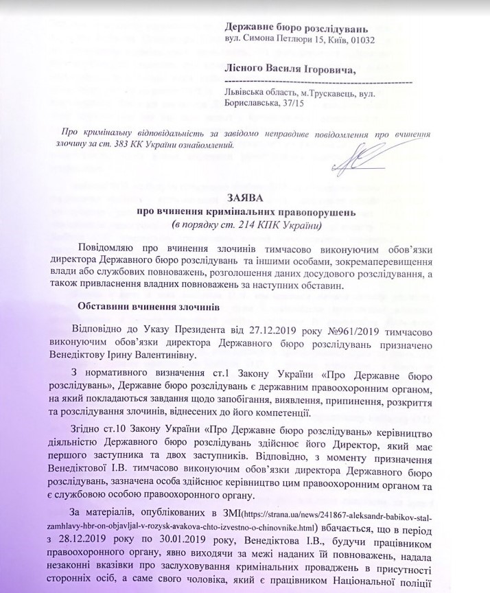 "В действиях Венедиктовой усматриваются признаки уголовного преступления, предусмотренного ч. 2 ст. 365, и ст. 387 УК Украины, то есть умышленное совершение работником правоохранительного органа действий, которые явно выходят за пределы предоставленных ему прав или полномочий, если они причинили существенный вред охраняемым законом правам, интересам отдельных граждан, государственным или общественным интересам, интересам юридических лиц, оскорбляющими личное достоинство потерпевшего, а также разглашение данных оперативно-розыскной деятельности или досудебного расследования", - отмечается в заявлении.