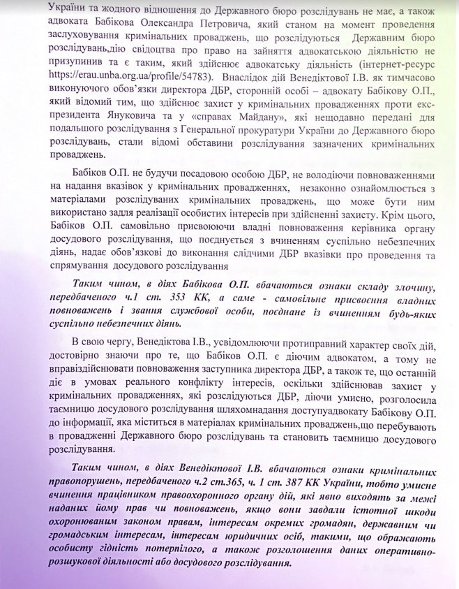 Как отмечается в заявлении, в период с 28 по 30 декабря Венедиктова, выходя за рамки своих полномочий, дала незаконные указания про слушания уголовных производств в присутствии посторонних лиц, а именно своего мужа, который является сотрудником Нацполиции и не имеющего никакого отношения к ГБР, а также адвоката Александра Бабикова, которого презентовали как будущего заместителя главы ГБР, однако он еще не получил никакого официального статуса. При этом уже требует на рассмотрение уголовные дела и ставит задачи следователям (подробнее об этом можно прочитать здесь).
