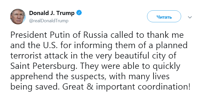 "Президент России Путин позвонил, чтобы поблагодарить меня и США за информацию о запланированном теракте в прекрасном городе Санкт-Петербурге. Они смогли быстро задержать подозреваемых и многие жизни были спасены. Отличная и важная координация!" - похвалил Трамп совместные действия властей стран.