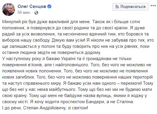 "Я желаю всем нам одного – победы! Потому что без нее у нас нет будущего. Потому что без нее мы не будем иметь свою страну. Потому что мне не безразлично название улиц, по которым я хожу в своем городе. Я хочу ходить по проспекту Бандеры, а не Сталина. И к слову, Степан Андреевич, с праздником!" – написал Сенцов в Facebook.
