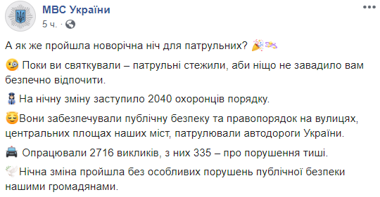 В новогоднюю ночь за правопорядком в украинских городах следили 2040 сотрудников МВД, на улицы Украины вывели дополнительные наряды полиции и Нацгвардии. В целом ночь прошла без особых нарушений публичной безопасности украинцами. Об этом сообщили в пресс-службе Министерства внутренних дел в Facebook.