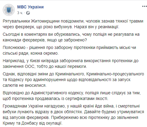 Напомним, в новогоднюю ночь в Житомирской области, взорвавшийся фейерверк проломил череп мужчине.