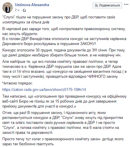 Депутат от "Голоса" Александра Устинова заявила, что ГБР объявило конкурс на должности заместителей директора с нарушением законодательства. Она отметила, что конкурс объявили 30 декабря, подача документов до 3 января, при том, что некоторые справки необходимо собирать больше недели, а не в новогоднюю ночь.