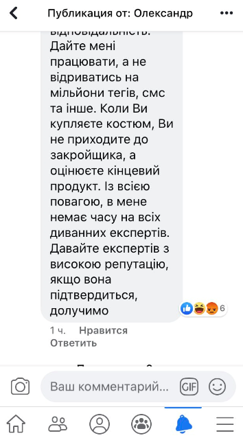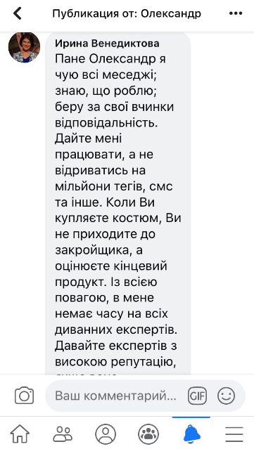 "Я слышу все мессенджи, знаю, что делаю, беру за свои поступки ответственность. Дайте мне работать, а не отрываться на миллионы тегов, смс и прочее. Когда вы покупаете костюм, Вы не приходите к закройщику, а оцениваете конечный продукт. При всем уважении, у меня нет времени на всех диванных экспертов. Давайте экспертов с высокой репутацией, если она подтвердится - привлечем", - ответила она на предложение в сети.