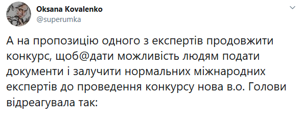 На предложение одного из экспертов продолжить конкурс, чтобы дать возможность людям подать документы и привлечь достойных международных экспертов к проведению конкурса новая и.о. председателя Ирина Венедиктова в соцсети отреагировала следующим образом.
