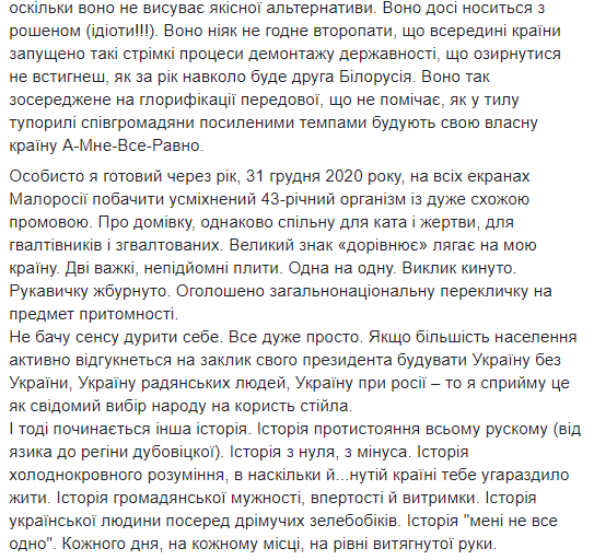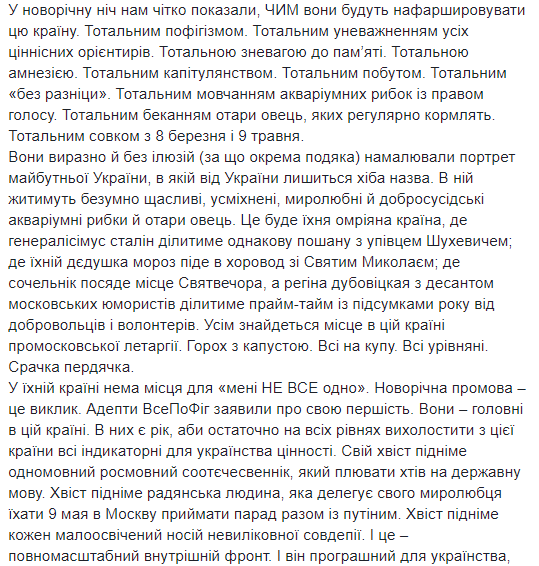"Я более чем доволен новогодней речью 42-летнего организма, который открыто назвал сам себя врагом украинства. Оно появилось во всей своей красе. Игра окончена. Маски сожжены", - написал скандальный телеведущий.