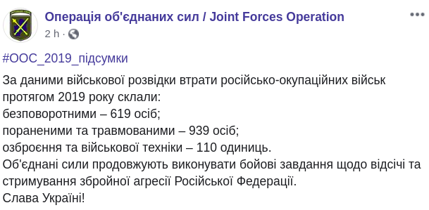 В штабе ООС отчитались, что в 2019-м убили более 600 солдат противника