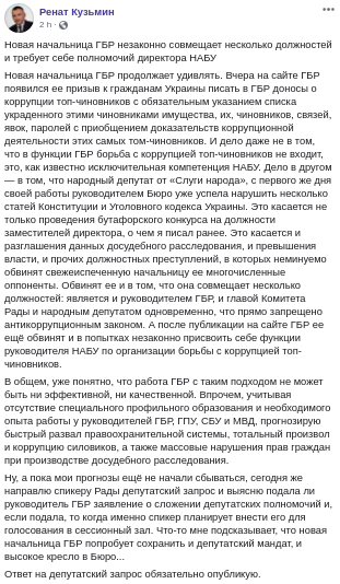 "Новая начальница ГБР продолжает удивлять. Вчера на сайте ГБР появился ее призыв к гражданам Украины писать в ГБР доносы о коррупции топ-чиновников с обязательным указанием списка украденного этими чиновниками имущества, их, чиновников, связей, явок, паролей с приобщением доказательств коррупционной деятельности этих самых том-чиновников", - написал Кузьмин.