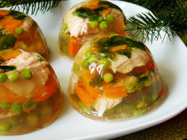 3. Заливное из рыбы и овощей. Трудоемкое по приготовлению, но эффектное и вкусное заливное блюдо из рыбы. Как вариант, можно к столу на 7 января приготовить холодец.