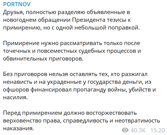 "Друзья, полностью разделяю объявленные в новогоднем обращении Президента тезисы к примирению, но с одной небольшой поправкой.
