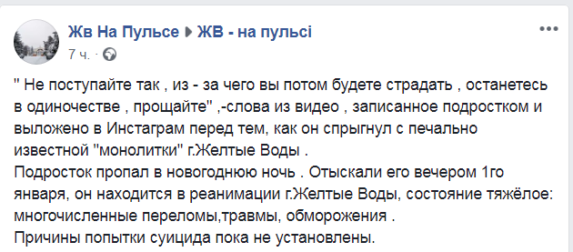 В городе Желтые Воды Днепропетровской области 15-летний парень попытался покончить с собой, спрыгнув с высотного здания. Об этом передает в Facebook сообщество "ЖВ на пульсе".