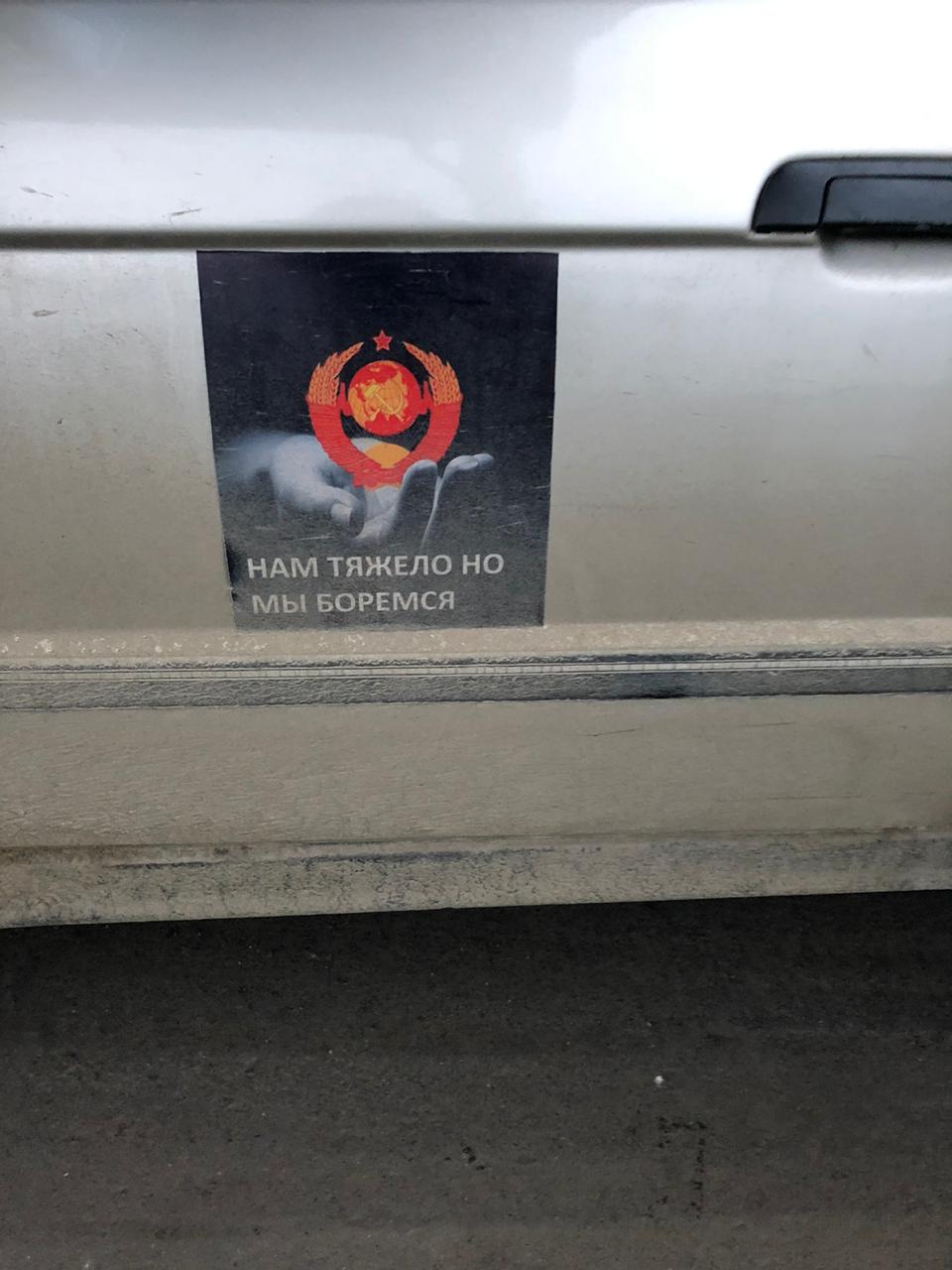 Так, на корпусе машины был большой советский герб, сбоку - наклейка с меньшим гербом и надписью: "Нам трудно, но мы боремся". Аналогичная символика (герб) была на номерных знаках.