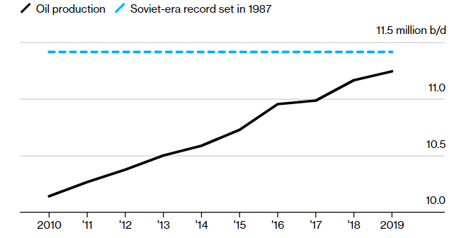 По показателю добычи нефти Россия впервые со времен своей независимости приблизилась к достижению 1987 года. Тогда в СССР добывались рекордные 11,416 миллиона баррелей в день. В 2018 году из недр извлекалось на 0,8% черного золота меньше.
