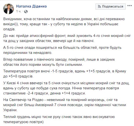 Начиная с этих выходных, 4 и 5 января, в Украине ожидается больше осадков. Об этом синоптик Наталья Диденко сообщила в Facebook.
