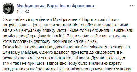 В ночь на 3 января в Ивано-Франковске  сотрудники "Муниципальной стражи" снимали местного жителя с главной елки города. Инцидент произошел во время пешего патрулирования центральной части города. "Муниципалы" увидели, что на главную елку забрался мужчина. Об этом сообщается на странице стражей порядка в соцсети.