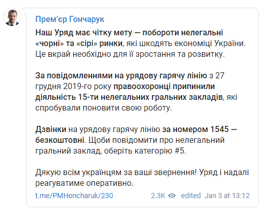 Гончарук заявил о закрытии 15 игорных заведений за последнюю неделю
