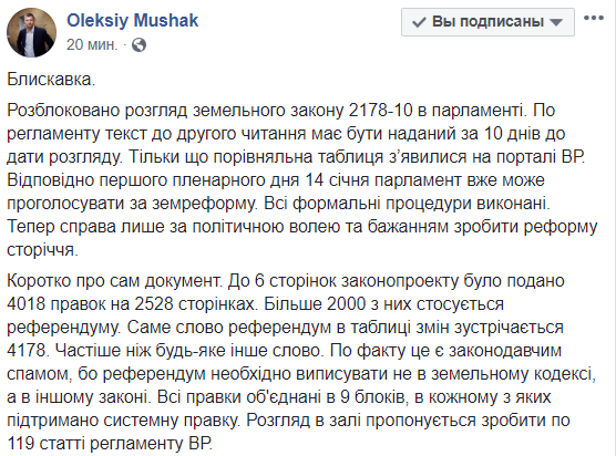 "К 6 страницам законопроекта было подано 4018 поправок на 2528 страницах. Более 2000 из них касается референдума. Само слово "референдум" в таблице встречается 4178 раз. Чаще чем любое другое слово. ... Все правки объединены в 9 блоков, в каждом из которых поддержана системная правка", - написал экс-нардеп от Блока Порошенко на своей странице в Facebook.